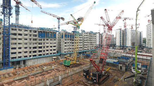 With the Crane Machine Guidance technology, two mobile cranes can be safely deployed side by side within a confined space. [Photo credit: HDB]