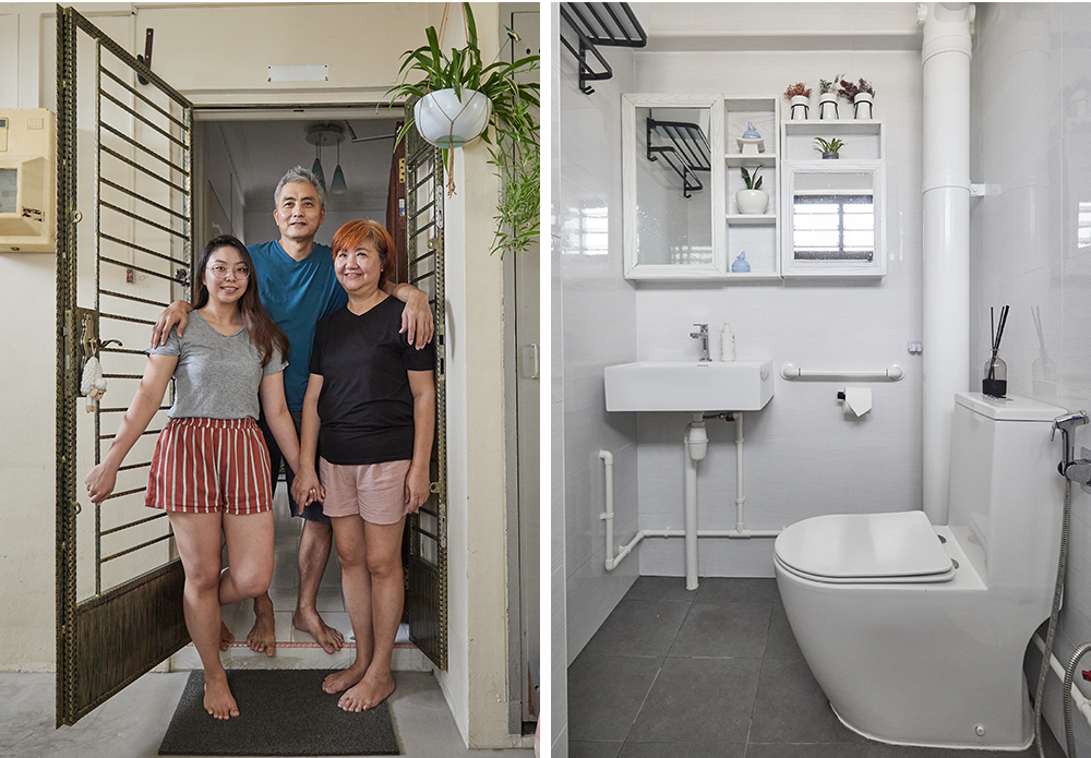 Residents like Mr Chua Soo Eng and his family (pictured left) have benefitted from enhancements such as a new main entrance gate and toilet upgrading as part of HIP