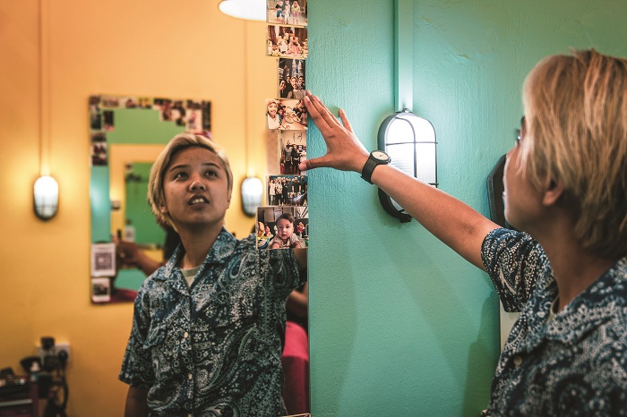 Photos of Rafidah with her loved ones and customers adorn the mirror