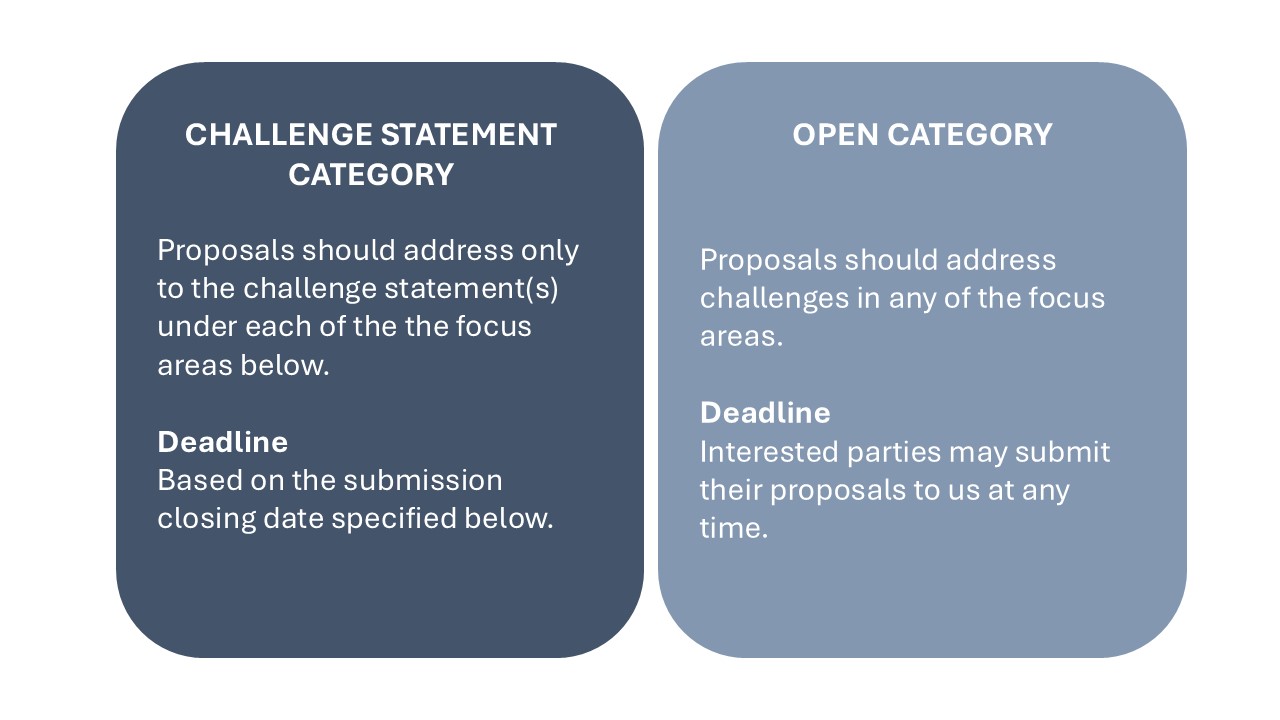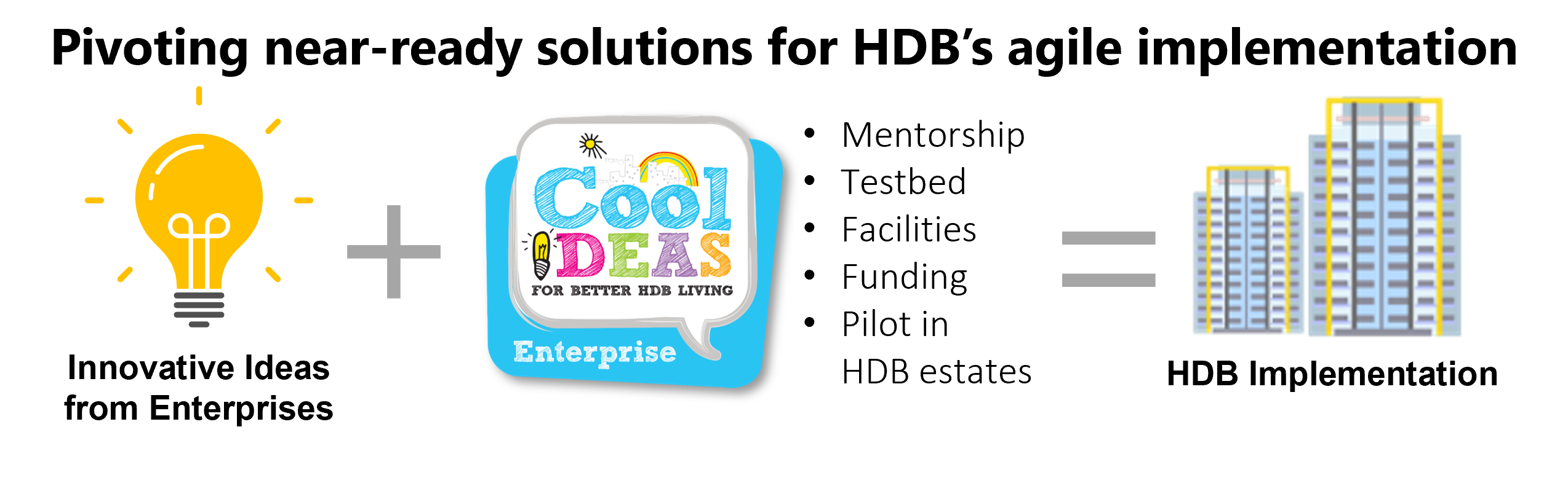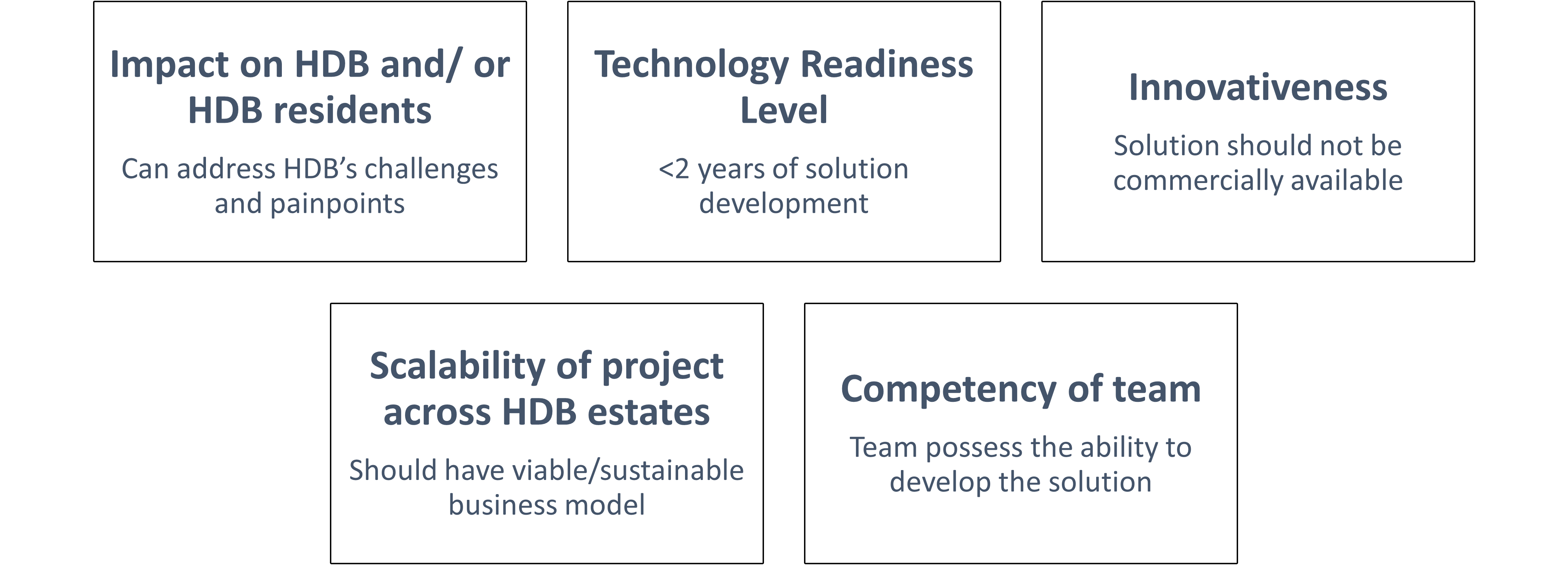 We are looking for solutions that can be developed and piloted in our Living Labs such as Punggol, Yuhua, Teck Ghee, and Tengah. You can fill up the application form and submit your Open Category Proposal to HDB_CoolideasENT@hdb.gov.sg.