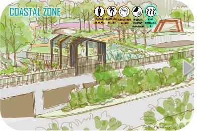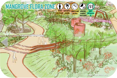 Paving and landscape structures in warm colours with red feature planting evoke a sense of warmth in the Mangrove Flora Zone.
