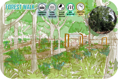 Residents will get to enjoy the riverine landscapes and shared facilities that are inspired by nature, such as mangrove creature-themed playgrounds. This design also contributes to the ecosystem services indicated.