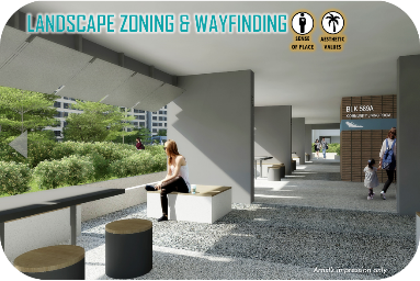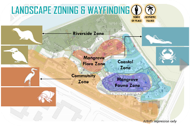 The large precinct will be divided into zones and assigned mangrove creature-inspired symbols and distinct colours to help residents navigate with ease. For example, the symbols and colours will be used to inform the design of spaces like the Community Living Rooms, and add character to void decks.