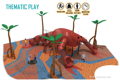 Play in unique playgrounds featuring local coastal mangrove creatures, such as mud lobsters and mudskippers.