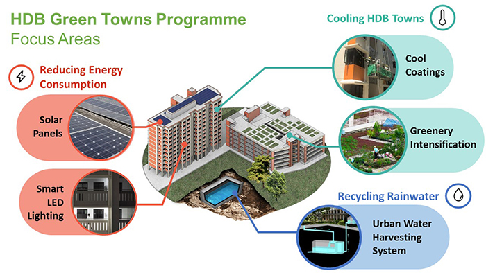The HDB Green Towns Programme will focus on 3 areas: reducing energy consumption, recycling rainwater, and cooling HDB towns, making all HDB towns more sustainable and liveable