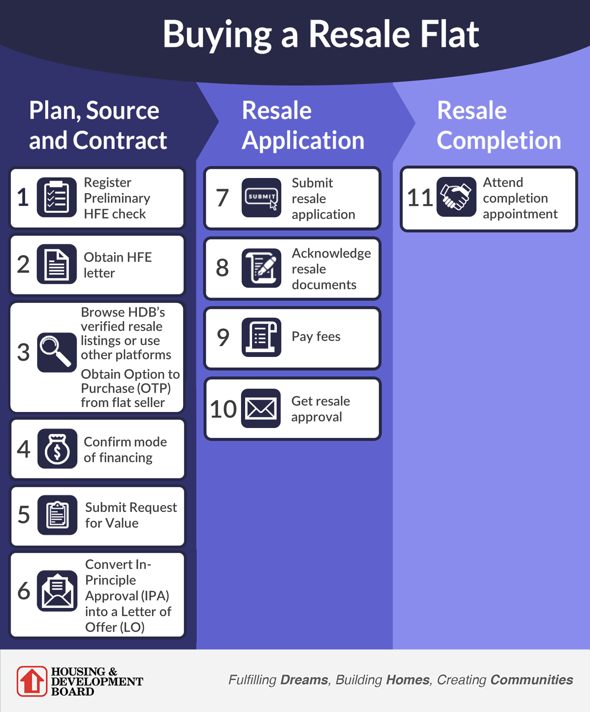Log in to My Flat Dashboard on HDB Flat Portal to start your journey. You will be guided through the following steps for the buying process: