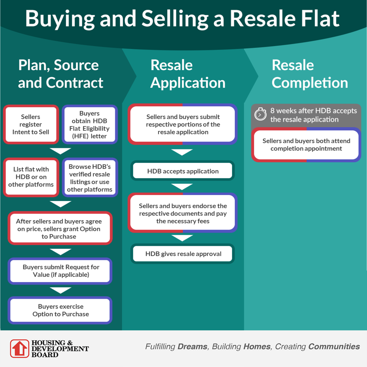 Upon receiving a complete resale application and the full set of supporting documents from you and the sellers, we will verify the eligibility of both parties and accept the resale application within 28 working days. We will prepare the necessary documents for you and the sellers to endorse, which will be ready about 3 weeks after the application has been accepted. You and the sellers must acknowledge and endorse the resale documents, and pay the necessary fees.