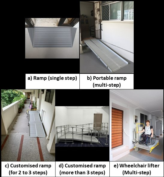 Ramps (single and multi-step) a. Ramp (single-step) b. Portable ramp (multi-step) c. Customised ramp (for 2 to 3 steps) d. Customised ramp (more than 3 steps) e. Wheelchair lifter (multi-step)