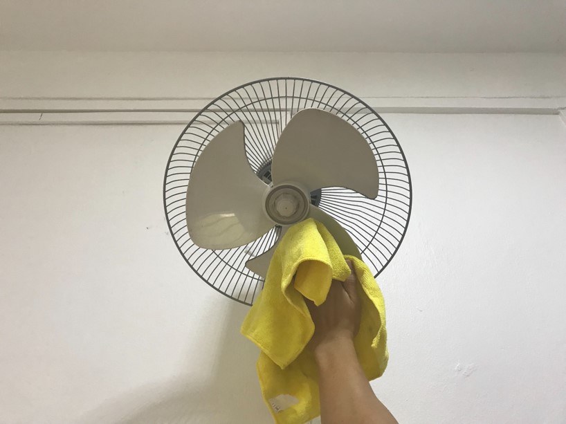 For thicker layers of dust, wipe the top and bottom of each fan blade with a damp cloth. Avoid shaking or bending the fan blades excessively to prevent damage.